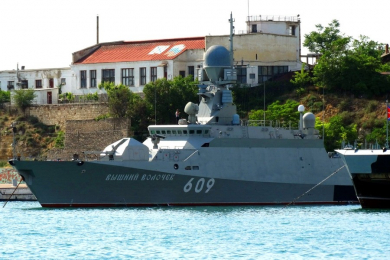 МРК «Вышний Волочёк» - малый ракетный корабль проекта 21631. Основное назначение МРК - охрана и защита экономической зоны государства. Многоцелевой корабль класса «река-море», оснащен современным артиллерийским, ракетным, противодиверсионным, зенитным и радиотехническим вооружением. Входит в состав Черноморского флота ВМФ России. «Вышний Волочёк» - шестой корабль модернизированной серии «Буян-М», которые имеют увеличенное водоизмещение и оборудованы новейшим высокоточным ракетным оружием большой дальности - универсальным ракетным комплексом «Калибр-НК», для поражения морских и береговых целей.