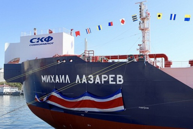 6 октября 2019 года у причала Морского вокзала во Владивостоке состоялась торжественная церемония поднятия государственного флага Российской Федерации на новом танкере «Михаил Лазарев». Судно будет перевозить грузы по маршрутам Северного морского пути в районе Обской губы. В событие приняли участие председатель Совета директоров ПАО «Совкомфлот» Сергей Франк, заместитель министра экономического развития РФ Оксана Тарасенко и вице-губернатор Приморского края Олег Мельников. «Крестной матерью» танкера выбрали Оксану Тарасенко. Именно она провела церемонию имянаречения судна.