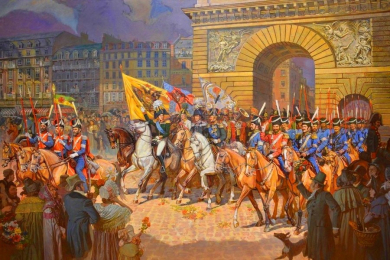 В поверженный Париж 31 марта 1814 года торжественно вступили отборные части Российской армии во главе с императором Александром I и командующими союзных войск. Во время сражения за Париж Бонапарт покинул столицу, предоставив руководство сражением и капитуляцию маршалам де Мармону и Мортье. Ночью была подписана капитуляция Франции. Взятие Парижа, а также нежелание французской армии продолжать войну привели к образованию Временного правительства, отречению Наполеона от трона и восстановлению монархии во Франции.