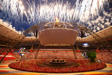 На сцене, выстроенной в виде пирамиды, была установлена Чаша Огня весом в 470 тонн, стадион освещали 2 000 ламп. Каждому зрителю на входе выдали 3D очки для просмотра уникальной трехмерной постановки. Ярким фрагментом церемонии было театрализованное шествие российских народов. Ведущую роль парада исполнял Человек - творец истории. Перед зрителями предстало многообразие традиций, легенд и ремесел народностей нашей страны.
