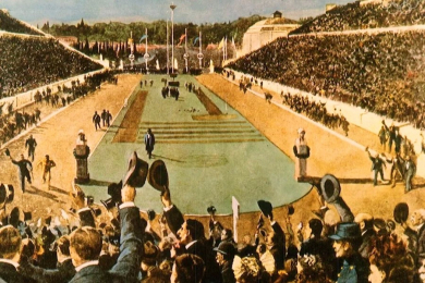 Первые летние Олимпийские игры в городе Афины, Греция, открылись 6 апреля 1896 года пушечным выстрелом, ввысь взметнулись звуки олимпийского гимна, сопровождаемого ангельским пением женского хора. На Мраморном стадионе в присутствии восьмидесяти тысяч зрителей король Греции Георг I объявил об открытии Олимпиады.