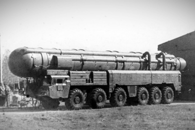 Советский подвижный грунтовый ракетный комплекс стратегического назначения РТ-2ПМ «Тополь» с трехступенчатой твердотопливной межконтинентальной баллистической ракетой.