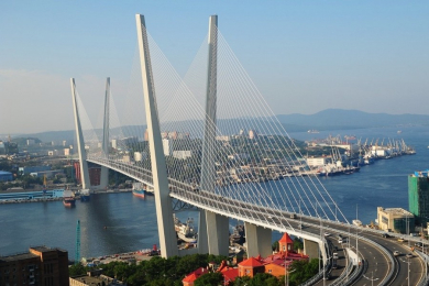 Русский мост - вантовый мост во Владивостоке через пролив Босфор Восточный, соединяет полуостров Назимова с мысом Новосильского на острове Русском. Строительство было начато 3 сентября 2008 года в рамках программы подготовки города к проведению саммита АТЭС в 2012 году. Второй по высоте мост в мире, высота составляет 324 метра. Имеет самый большой в мире пролёт среди вантовых мостов, длиной 1104 метра. Мост изображён на купюре номиналом 2000 рублей, выпущенной Банком России 12 октября 2017 года.