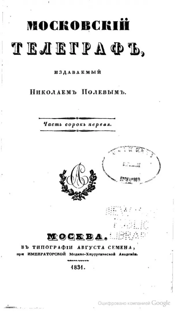 По высочайшему повелению 15 апреля 1834 года был закрыт «Московский телеграф» - энциклопедический журнал, по некоторым мнениям «решительно лучший в России от начала журналистики», выходивший с 1825 года.