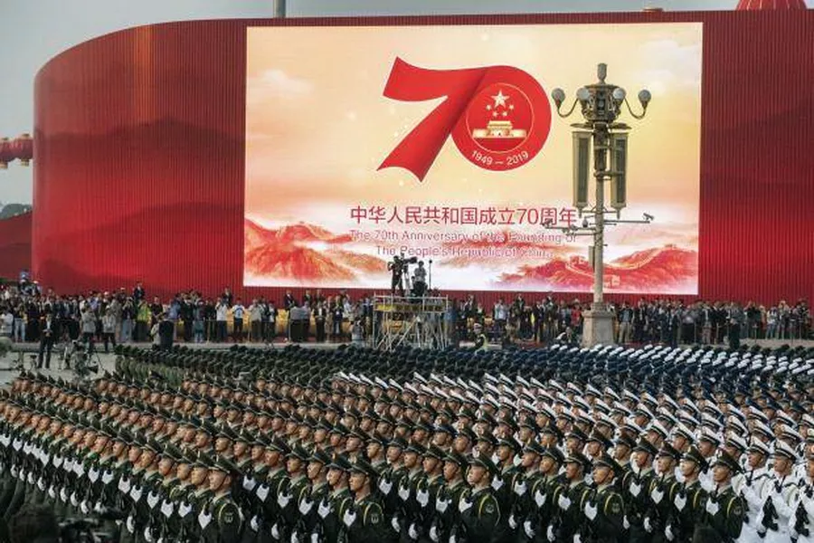 На центральной площади Тяньаньмэнь в Пекине 1 октября 2019 года прошли мероприятия в честь 70-летия образования Китайской Народной Республики. На трибуну ведущих к Запретному городу Ворот Тяньаньмэнь поднялись председатель КНР Си Цзиньпин, премьер Госсовета Ли Кэцян, другие члены руководства страны, а также бывший глава страны Цзян Цзэминь. Под 70 залпов орудий знаменная группа почетного караула Народно-освободительной армии вынесла на площадь флаг КНР, после чего сводный военный оркестр исполнил государственный гимн.