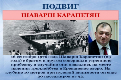 Спасение: 16 сентября 1976 года Шаварш Карапетян с братом и другом совершали утреннюю пробежку и случайно оказались на месте падения троллейбуса в Ереванское озеро. Карапетян взял наиболее сложную часть работы по погружению и спасению людей на себя. Он передавал брату спасенных людей, а брат - на лодку, из лодки - в машину. На глубине 10 метров при нулевой видимости Шаварш разбил ногами заднее окно троллейбуса и вытащил 46 пассажиров из 92. Однако лишь 20 из них удалось вернуть к жизни. Пассажиров без сознания доставляли в больницу. Врачи, оказывавшие помощь, не знали, что их неожиданных пациентов вытащил из воды всего один человек. Все думали, что ведется слаженная работа спасателей. Силы пловца были на исходе. Вынырнув в очередной раз, Шаварш осознал, что вытащил не человека, а подушку от сиденья троллейбуса. По его словам, эта подушка часто снилась ему по ночам, ведь он мог спасти жизнь еще одному человеку. Остальных пассажиров спасти не удалось. Все тело пловца было изрезано осколками разбитого окна. После этого Карапетян тяжело заболел пневмонией, которая осложнилась сепсисом. Температура держалась на уровне 40°C. В больнице провел 45 дней.