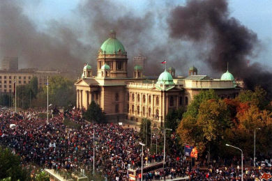 На президентских выборах в 2000 году победил его соперник Войислав Коштуница, однако он не набрал абсолютного большинства голосов. Милошевич потребовал проведения в соответствии с законом второго тура голосования, но в результате уличных демонстраций при поддержке США 5 октября 2000 года оказался свергнут. Уже 31 марта 2001 года бывший президент бал арестован югославскими властями по обвинению в коррупции.